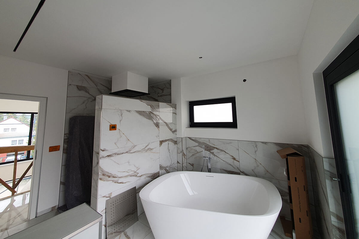 Fugen lassen sich schlecht reinigen und neigen zu Schimmel. Durch spezielle mineralische Putze lassen sich moderne Bäder fugenlos und trotzdem Feuchtigkeitsresistent gestalten.